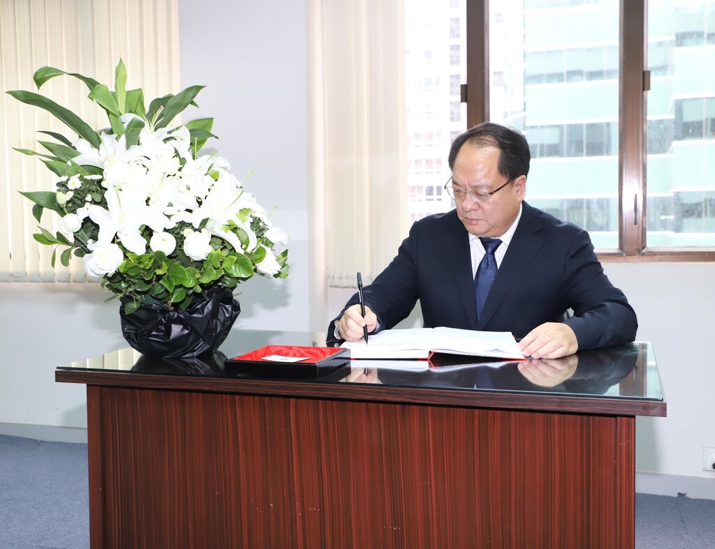 | Le commissaire adjoint Pan Yundong du bureau du commissaire du ministère chinois des Affaires étrangères pour la région administrative spéciale à Hong Kong (Chine) écrit le registre de condoléance. |