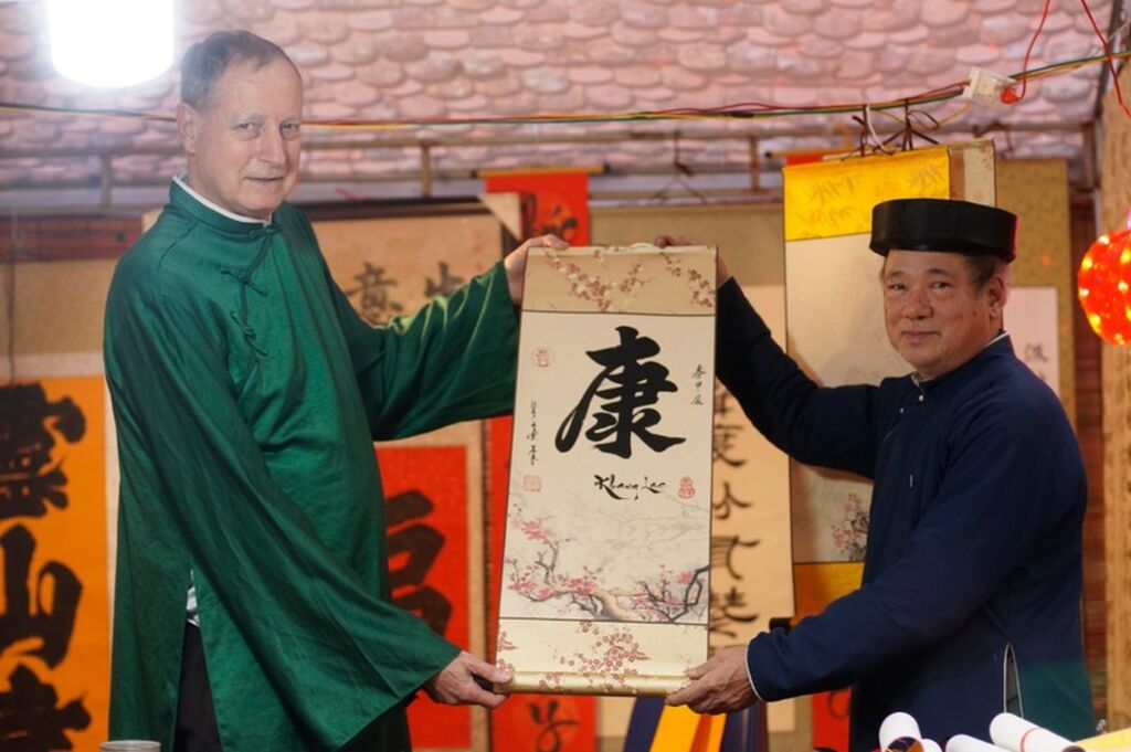 | L’ambassadeur d’Israël au Vietnam, Yaron Mayer (gauche), demande une calligraphie porte-bonheur à l’occasion du Nouvel An lunaire 2024. |