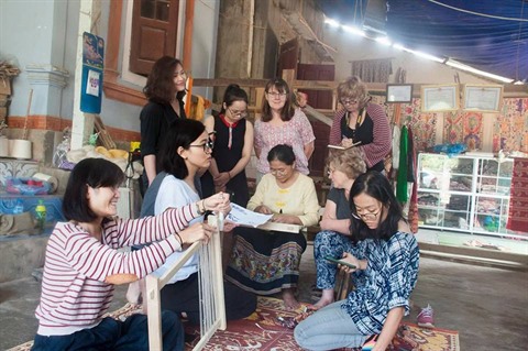 | Les touristes vietnamiens et étrangers découvrant la confection textile artisanale Thaï au village de Hoa Tiên. |
