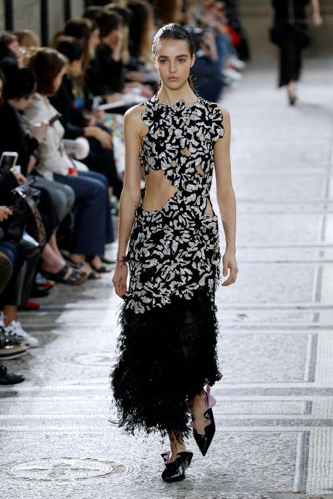 Dans le cloître du lycée Jacques Decour, au pied de la butte Montmartre, les créateurs Jack McCollough et Lazaro Hernandez ont fait défiler des silhouettes riches en volants, imprimés fleuris et dentelles, mais résolument modernes avec des ouvertures inattendues et un aspect non fini.
