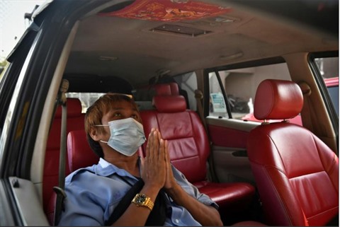 | Le chauffeur de taxi Wasan Sukjit prie dans sa voiture, le 3 mars 2021. |