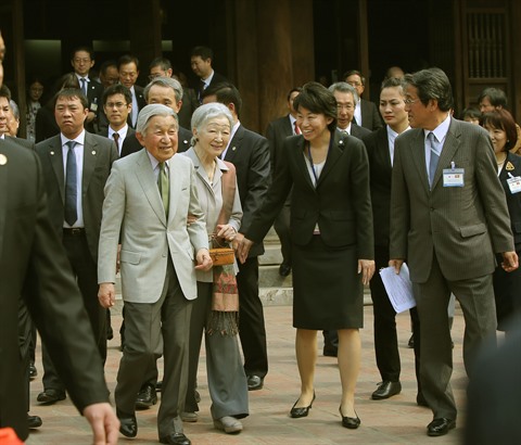 | L'empereur du Japon Akihito et son épouse Michiko rencontrent d'anciens étudiants vietnamiens au Japon, le 2 mars au Temple de la Littérature à Hanoï. |