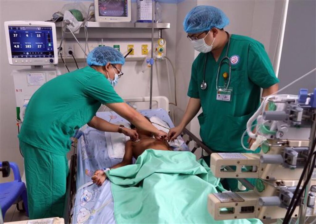 | Des médecins examinent l'état de santé de deux patients intoxiqués au botulisme sous surveillance médicale à l'Hôpital pour femmes et enfants de Dà Nang. |