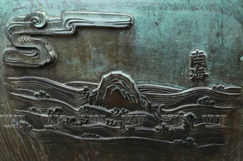 | L'image de souveraineté du pays sur les archipels des Spratly et Paracel apparaît clairement sur l'urne Cao, avec trois scènes : mer de l’Est (Dông Haï), bateau de l’armée et tortue (trionyx). |