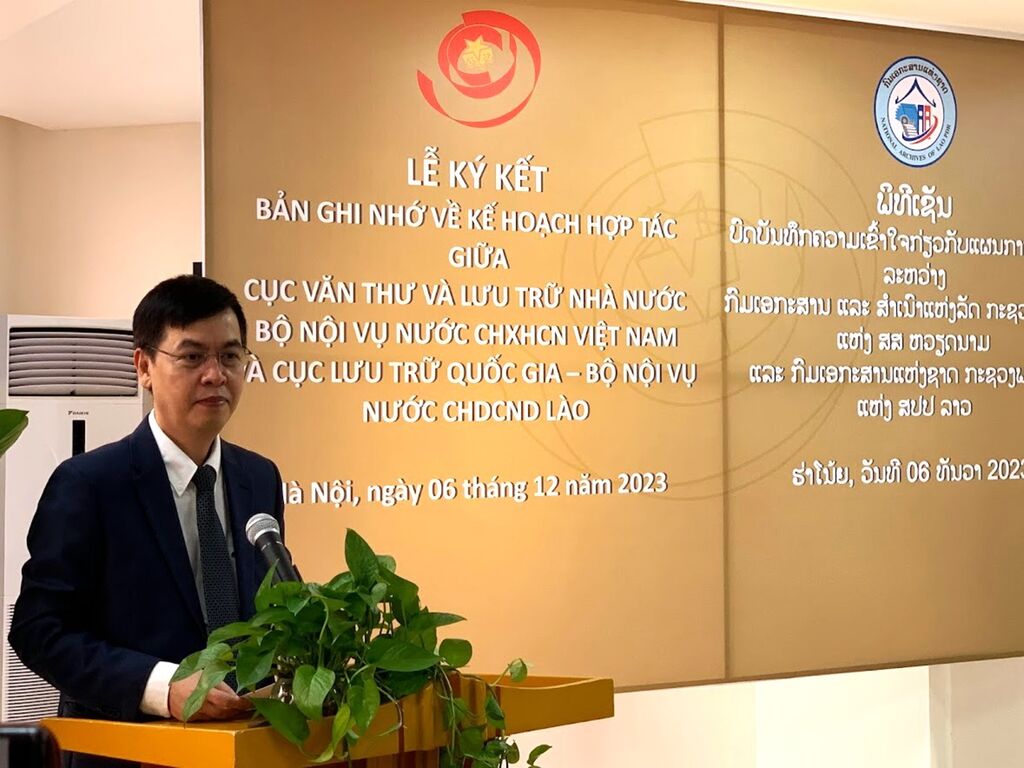 | Dang Thanh Tùng, directeur du Département de gestion des documents et des archives de l'État du Vietnam prend la parole lors de la signature à Hanoï, le 6 décembre. |