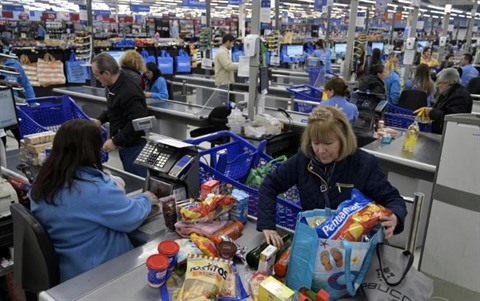 | Des clients à la caisse d'un supermarché Walmart à Buenos Aires, le 15 août. |