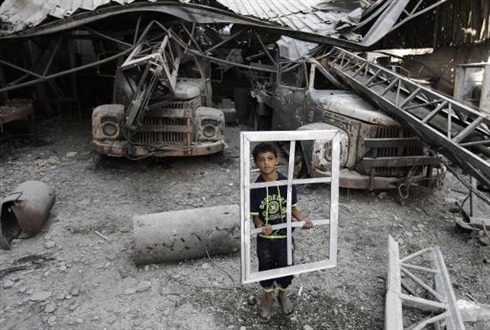 | Un jeune Palestinien tient l'encadrement d'une fenêtre, parmi les décombres d'une maison détruite, dans le quartier de Al-Shejaea proche de Gaza City, le 5 août |