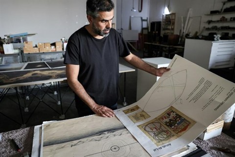 | L'artiste saoudien Ahmed Mater dans son atelier, le 19 juin à Riyad. |