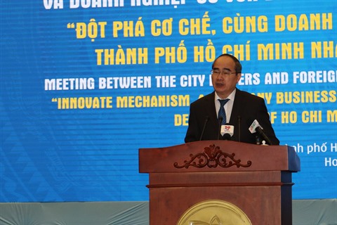 La rencontre entre dirigeants municipaux et entreprises étrangères en 2018 sur le thème "Mécanisme de percée et accompagnement des entreprises dans le développement rapide et durable de Hô Chi Minh-Ville" a eu lieu le 21 avril dans la mégapole du Sud sous la présidence du secrétaire du Comité municipal du Parti, Nguyên Thiên Nhân et le président du Comité populaire municipal Nguyên Thành Phong.