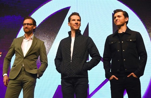 | Les acteurs Tom Hiddleston, Benedict Cumberbatch et Tom (de gauche à droite), lors de la promotion du film Avengers: Infinity war, le 12 avril à Séoul. |
