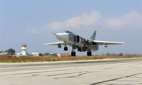 | Un bombardier russe Sukhoi Su-24 décolle de la base aérienne de Hmeimim, dans la province de Lattaquié, en Syrie, le 3 octobre 2015. |
