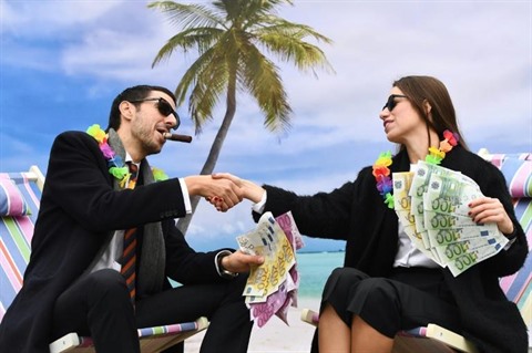 | Des militants de l'ONG Oxfam jouent une scénette dénonçant les paradis fiscaux, à Bruxelles. |