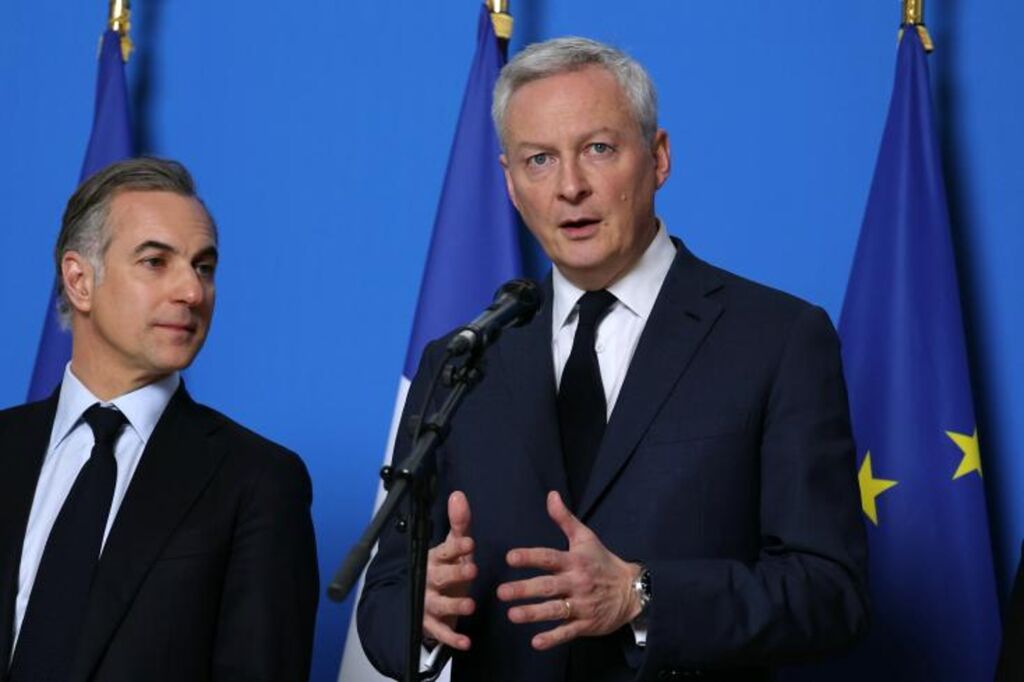 | Le ministre de l'Économie Bruno Le Maire (droite) et le président de la Fédération bancaire française Nicolas Namias, lors de l'annonce de mesures de soutien au secteur agricole, le 27 février à Paris. |