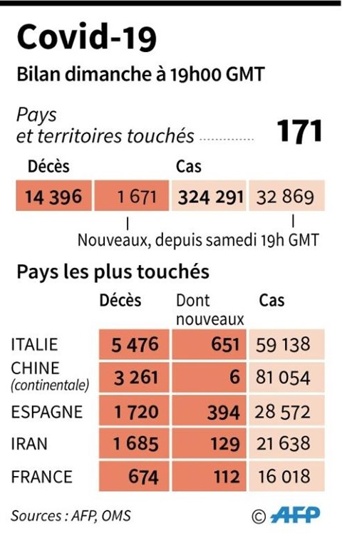 Le coronavirus a fait plus de 14.000 morts, dont plus de 7.500 en Europe, et contaminé plus de 324.000 personnes dans le monde, dont la moitié sur le Vieux Continent. Près d'un milliard de personnes à travers la planète doivent rester chez elles pour tenter d'entraver le virus. L'Italie paie le plus lourd tribut, et de loin, avec 5.476 morts au total dont 651 morts en 24 heures selon le dernier bilan disponible dimanche 22 mars. Une baisse néanmoins par rapport au pic de 793 morts la veille.