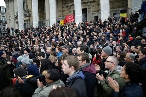 | Rassemblement pour une minute de silence le 23 mars place de la Bourse à Bruxelles. |