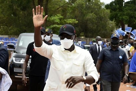| Le président sortant Patrice Talon salue ses partisans, le 9 avril 2021 à Abomey-Calavi, au Bénin. |