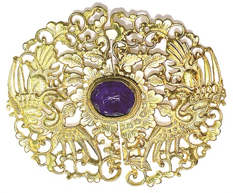 Ainsi, du XVe siècle jusqu’au début du XXe, ce type de bouton épingle est resté attaché comme bijou d’honneur sur les costumes rituels des rois,
