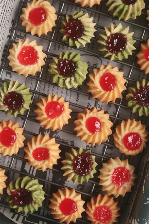 - À l’aide de poches à douille, former des biscuits en forme de fleurs ou d’étoiles, selon les goûts. Presser légèrement au centre de chacun pour y faire un petit trou. Y ajouter la confiture de fraise et d’orange.