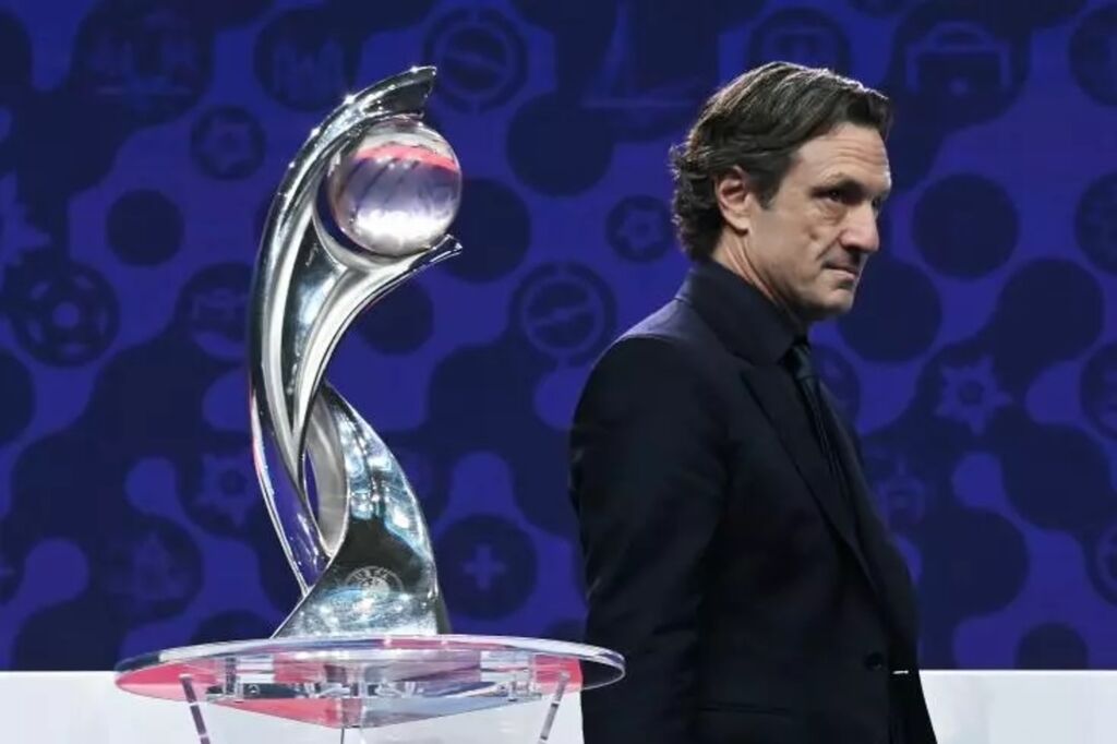 | Le sélectionneur des Bleues, Laurent Bonadei, derrière le trophée de l'Euro-2025 féminin de football lors du tirage au sort le 16 décembre à Lausanne. |
