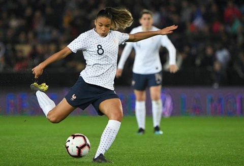 | La Française Delphine Cascarino auteure d'un doublé lors de la victoire 4-0 sur le Danemark à Strasbourg en match amical. |