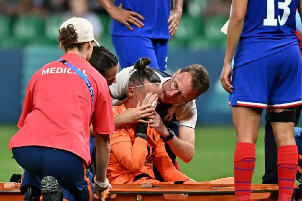 Sortie sur civière, elle souffre d'une entaille à l'œil droit, selon le staff des Bleues. Dans la foulée, les Bleues ont perdu leur capitaine Wendie Renard, victime d'une béquille au quadriceps, selon Hervé Renard. La taulière a tenté de revenir quelques minutes sur le terrain avec un bandage, en boitant bas, avant de demander son remplacement.