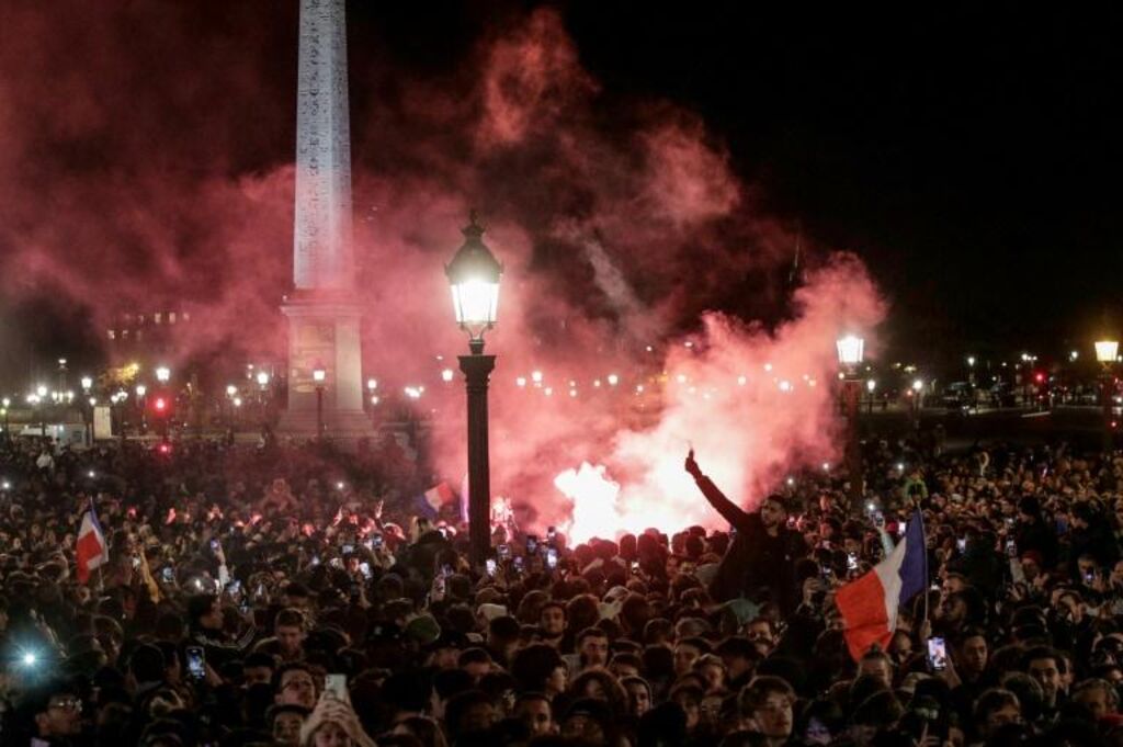 Arrivés une heure et demie plus tôt à l'aéroport de Roissy, les joueurs sont apparus vers 21h30 au balcon de l'hôtel Crillon sous les vivats des fans, de très jeunes gens en majorité, qui agitaient des drapeaux tricolores en scandant des "Merci les Bleus !" et en chantant la Marseillaise ou la chanson de Gala "Freed from desire", devenue l'hymne des Bleus pendant le Mondial.