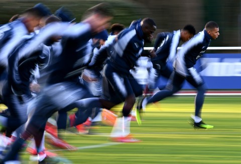 | Les joueurs de l'équipe de France à l'entraînement à Clairefontaine (Yvelines) le 19 mars 2019. |