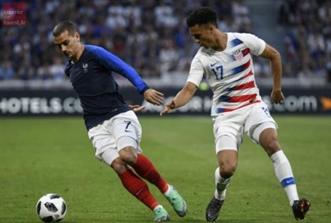 | L'attaquant français Antoine Griezmann (gauche) et le défenseur américain Antonee Robinson en amical le 9 juin à Décines-Charpieu, près de Lyon. |