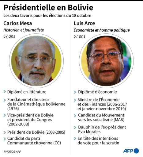 | Principales informations sur les deux favoris à la présidentielle du 18 octobre en Bolivie : le dauphin d'Evo Morales, Luis Arce, et l'ex-président centriste Carlos Mesa. |