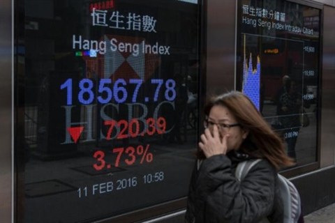 | Un panneau devant une banque montre l'évolution baissière de l'indice Hang Seng à Hong Kong (Chine), le 11 février. |