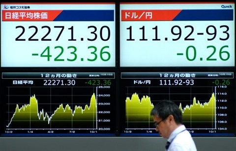 | Un passant marche devant des écrans montrant le prix d'actions et le taux de change de devises face au dollar américain à Tokyo, au Japon, le 15 octobre. |