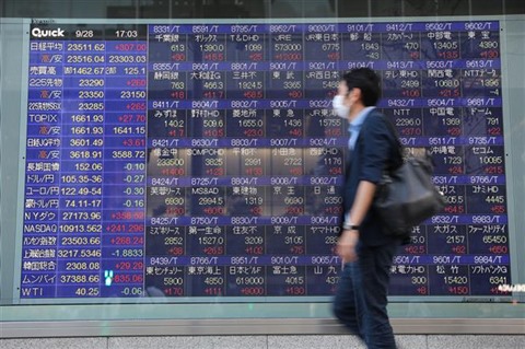 | Un passant masqué devant un tableau électronique de cotation de la Bourse de Tokyo. |