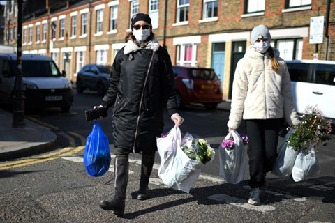 | Des Londoniens revenant du marché, le 22 mars |