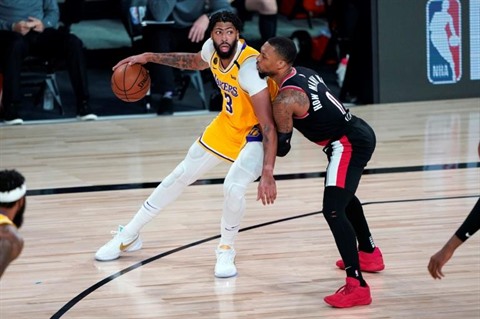 | Damian Lillard (Portland) défend devant Anthony Davis (Lakers) lors du premier tour des play-offs NBA le 18 août à Orlando. |