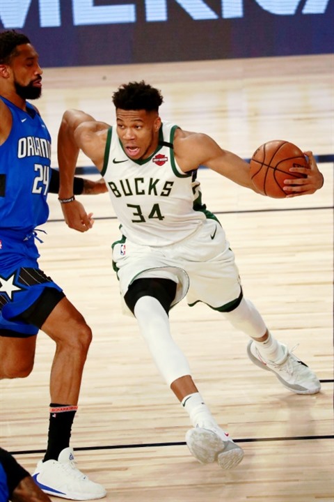 | Giannis Antetokounmpo (Milwaukee Bucks) tente d'effacer Khem Birch (Orlando Magic) lors du 1er tour des play-offs NBA le 18 août. |