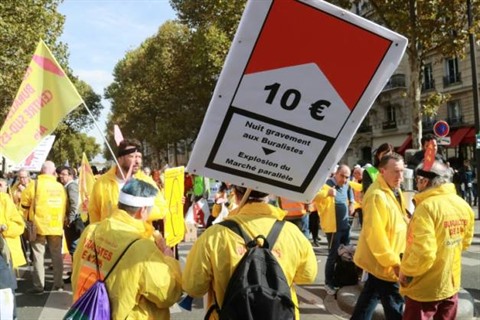 | Manifestation de buralistes entre le ministère de la Santé et l'Assemblée nationale à Paris, le 4 octobre à Paris. |