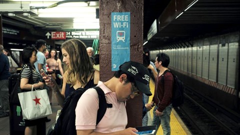 | Des personnes regardent leurs smartphones en attendant le train à New York, le 1er juillet |