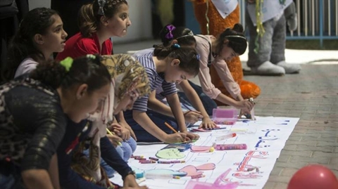 Des jeunes Palestiniens dessinent lors d'un camp d'été de l'ONU, le 23 juillet à Gaza. Photo : AFP/VNA/CVN |