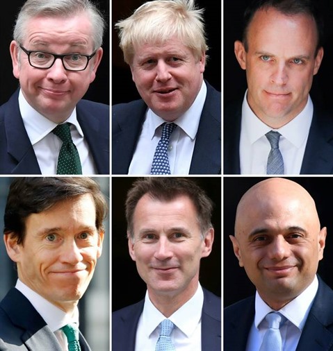 | Les six candidats encore en lice dans la course à la succession de Theresa May. De gauche à droite et de haut en bas: Michael Gove, Boris Johnson, Dominic Raab, Rory Stewart, Jeremy Hunt et Sajid Javid. |