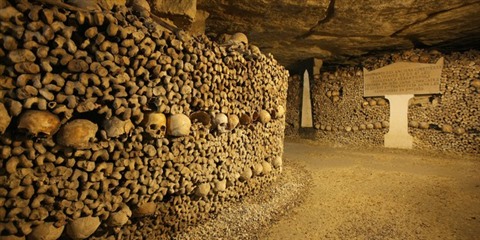 Les Catacombes de Paris, aménagées dans les galeries d'anciennes carrières à 20 mètres sous terre, rassemblent les restes de quelque 6 millions de Parisiens, transférés entre la fin du XVIIIe siècle et le milieu du XIXe au fur et à mesure que se fermaient certains cimetières.