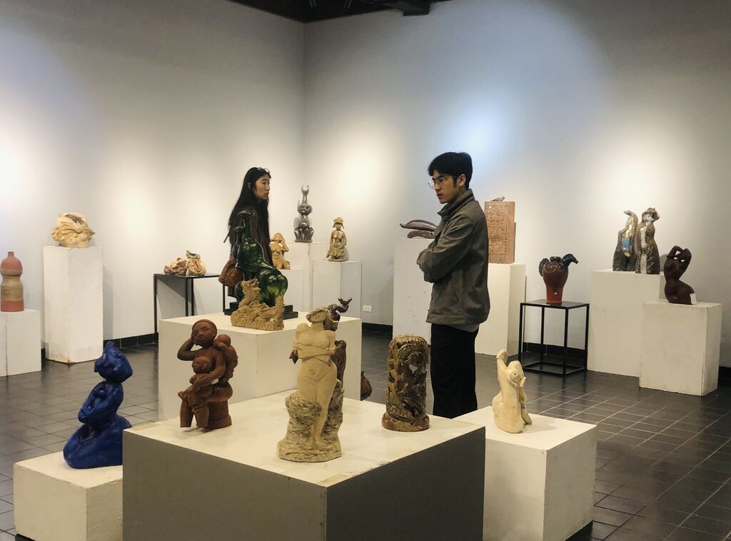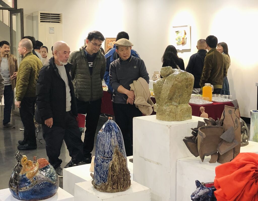 | Les visiteurs admirent les œuvres en céramique de l’exposition. |