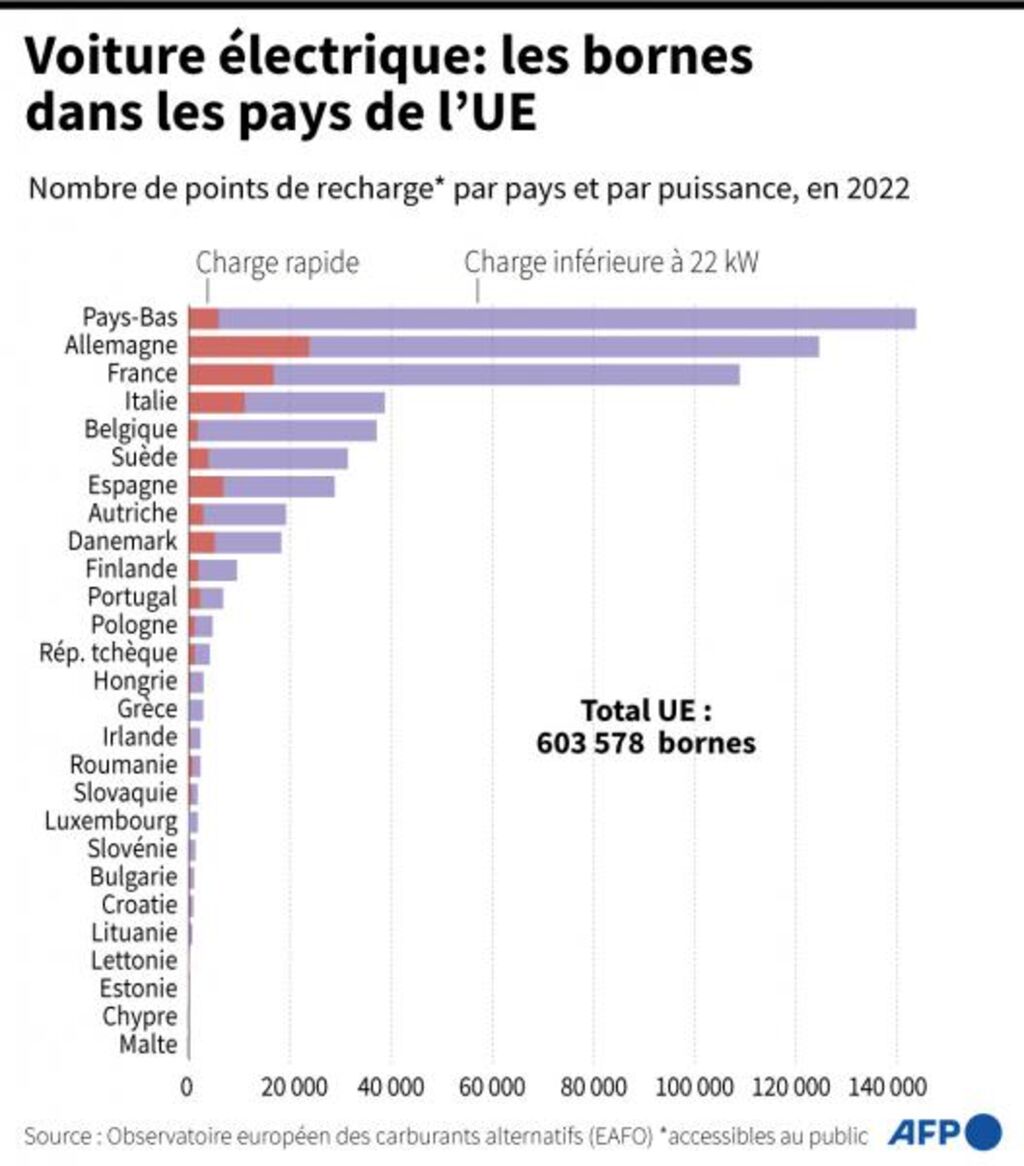 Sur 145.000 bornes du petit territoire - un tiers des points de recharge "publics" européens - 6.000 sont rapides ou ultra rapides, selon les chiffres de 2022 de l’Observatoire européen EAFO. En chiffres absolus, c'est exceptionnel pour un pays de cette taille.