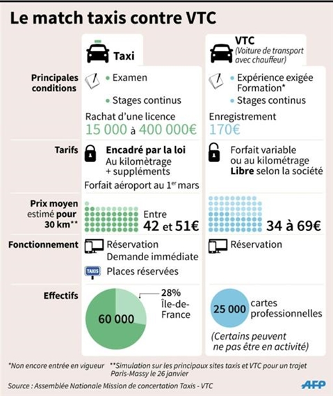 Cibles de leur colère : les chauffeurs d'Uber notamment, dont la justice a confirmé le 27 janvier qu'ils étaient "incités" à pratiquer le maraudage, ce que la loi leur interdit et que les taxis dénoncent. Le tribunal de grande instance de Paris a condamné Uber France à verser 1,2 million d'euros à l'UNT, qui accusait la société de VTC d'"ambiguïtés" dans sa communication.