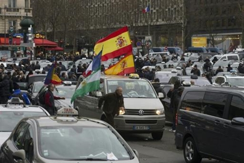 | Des chauffeurs de taxi manifestent Porte Maillot à Paris, le 27 janvier. |