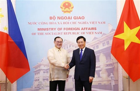 | Le vice-Premier ministre et ministre des Affaires étrangères, Pham Binh Minh (droite) et le chef de la diplomatie philippin, Teodoro Lopez Locsin, le 8 juillet à Hanoï. |