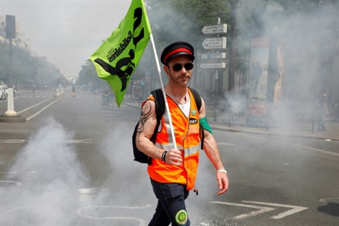 | Un membre du syndicat SUD participe à la manifestation contre la réforme ferroviaire, le 4 juin à Paris. |