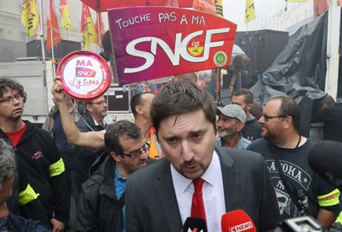 | Laurent Brun (centre), représentant de la CGT-Cheminots, lors d'une manifestation à Paris contre la réforme ferroviaire en mai 2018. |