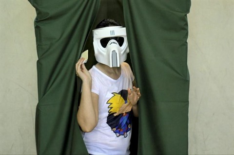 | Une Chilienne portant un masque de Star Wars vote dans un bureau de Santiago, le 25 octobre. |