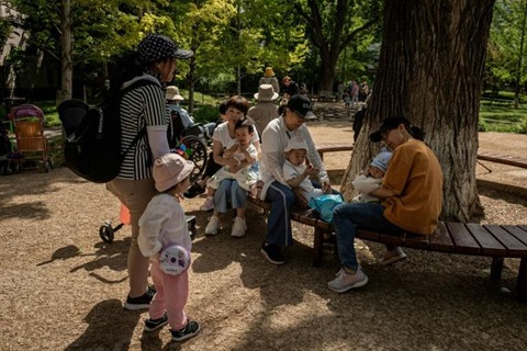 | Des femmes et des enfants dans un parc de Pékin, le 25 mai en Chine |