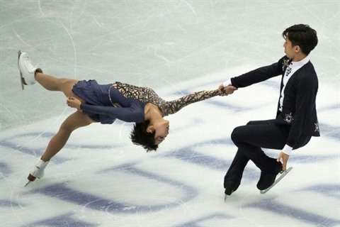| Le couple chinois Wenjing Sui (gauche) et Cong Han lors du programme court des Mondiaux de patinage artistique, le 20 mars à Saitama. |